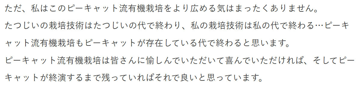 私が居なくなって、つらいことをてんちょーやまるちゃんに残したくはないし、その次の世代にも残したくはない…おばあちゃんの漬け物や野菜が売り場から消えていくように、ピーキャットもいずれ消えていくのが時代かな?と思っています。