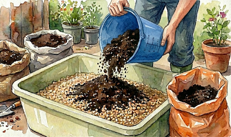 赤玉土やココピートなどを使う鉢やプランター栽培は「堆肥を土の割合で混ぜていく」という考えになります。