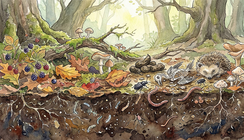 動物の糞や死骸も土に還ります。