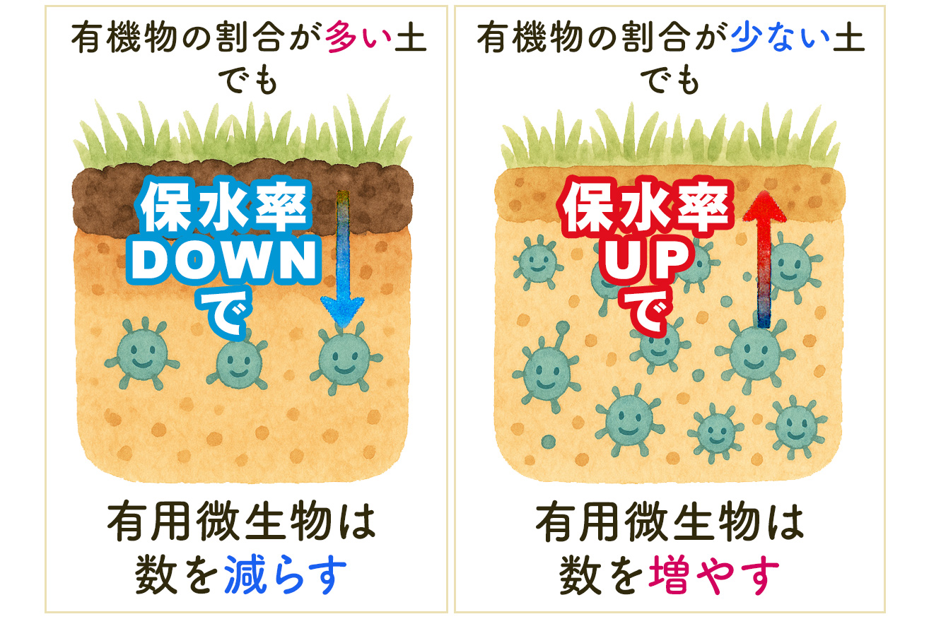 ですが、土壌の保水率が下がれば土壌の有機物の割合は多いのに有用微生物は数を減らします。