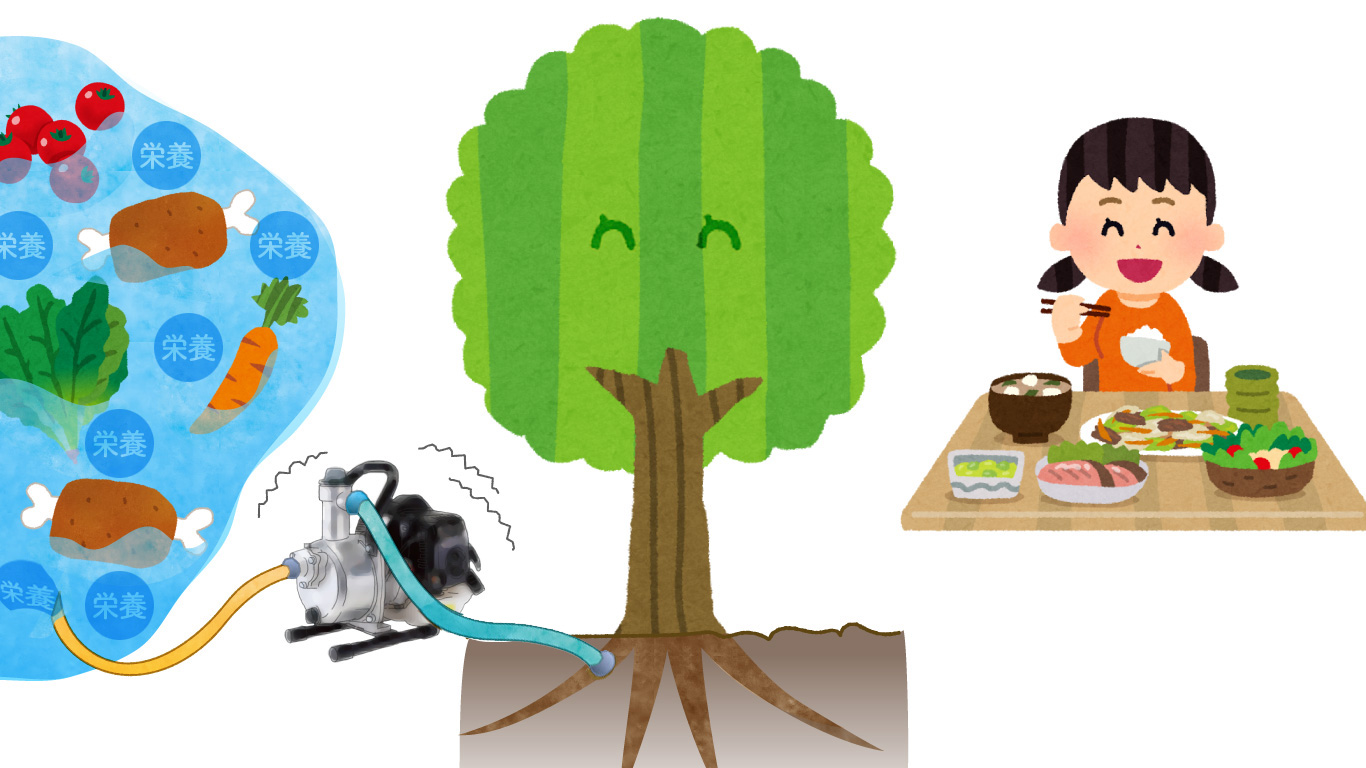 植物は土で肥料が分解され、水に溶けた栄養を根から吸収します。