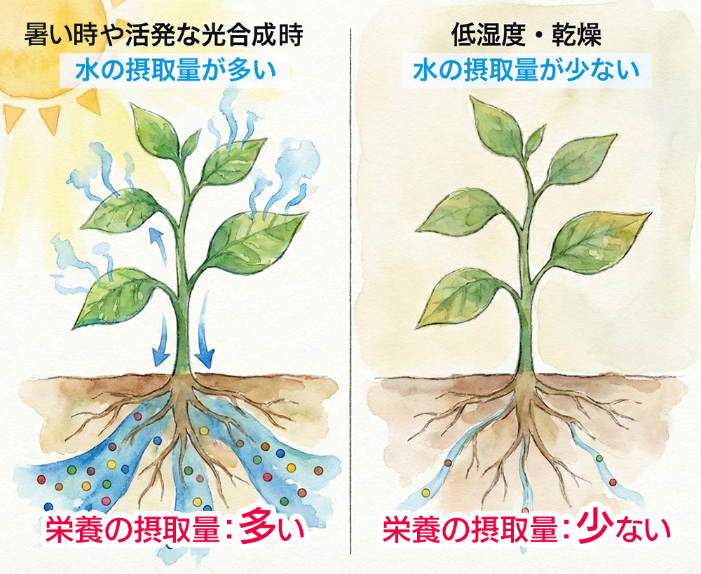 ・湿度が低いと水分を奪われないように水の蒸散を控えますので、水の摂取は少なくなります。